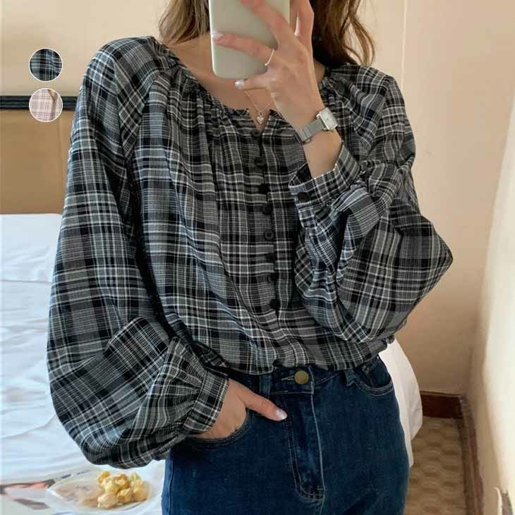 [AMELY by La-gemme]チェック柄ブラウス ガーリー ブラウス [AMELY by La-gemme]チェック柄ブラウス ガーリー ブラウス フリル 長袖 甘い 大人 デート お出かけ 女子会 韓国ファッション オルチャン 可愛い 【atp302-250】【予約販売:15-20日】【送料無料】メ込2