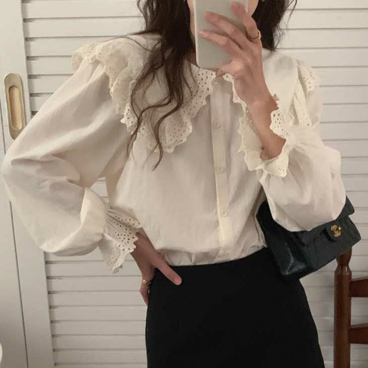 [AMELY by La-gemme]フリルカラーブラウス シャツ ボリューム袖 [AMELY by La-gemme]フリルカラーブラウス シャツ ボリューム袖 おしゃれ 韓国ファッション レトロ ガーリー デート かわいい 可愛い 長袖 フリル 【atp302-259】【予約販売:15-20日】【送料無料】メ込2