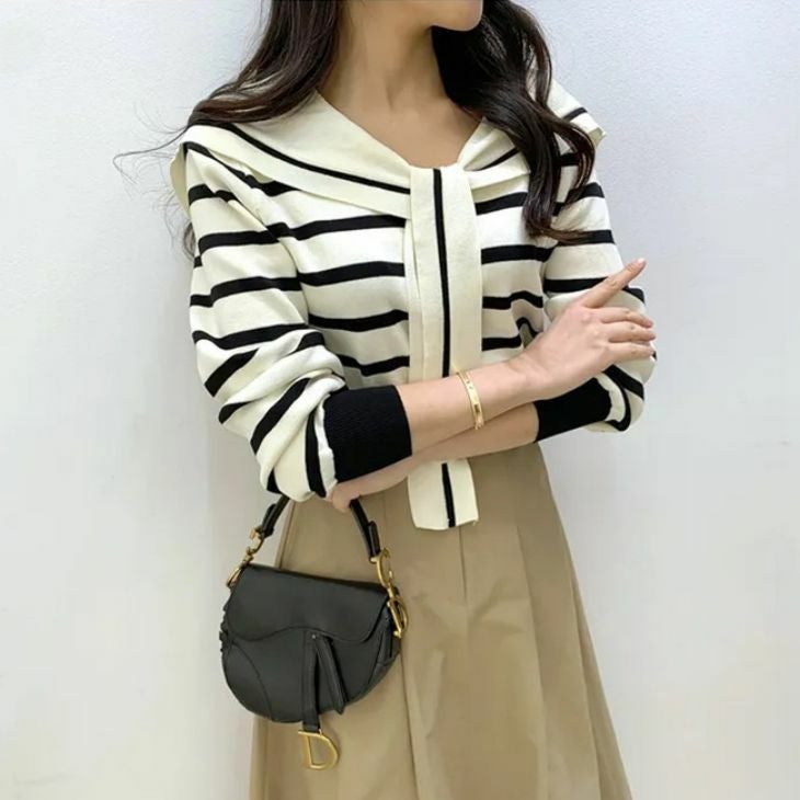 トップス ボーダー セーラーカラー ビッグカラー リブ袖 [AMELY by La-gemme]トップス ボーダー セーラーカラー ビッグカラー リブ袖 リボン ボウタイ ニット 長袖 春夏 おすすめ レディース オシャレ トレンド 人気 プチプラ 韓国ファッション【atp406-691】【予約販売:15-20日】【送料無料】メ込2