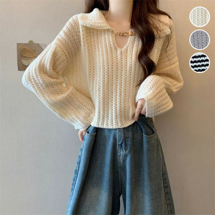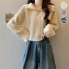キーネック ショート丈 ニット 襟付き フレア袖 [AMELY by La-gemme]キーネック ショート丈 ニット 襟付き フレア袖 長袖 前フック ゆったり カジュアル トップス 春夏 おすすめ レディース オシャレ トレンド 人気 プチプラ 韓国ファッション【atp406-697】【予約販売:15-20日】【送料無料】メ込2