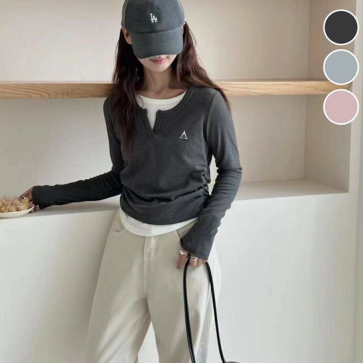 重ね着風 キーネック トップス ロンT ロングTシャツ [AMELY by La-gemme]重ね着風 キーネック トップス ロンT ロングTシャツ バイカラー 長袖 シンプル カジュアル 春夏 おすすめ レディース オシャレ トレンド 人気 プチプラ 韓国ファッション【atp406-703】【予約販売:15-20日】【送料無料】メ込2