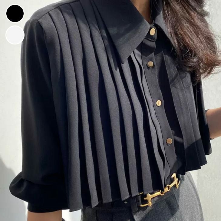 ビッグカラー プリーツ ブラウス シンプル 無地 [AMELY by La-gemme]ビッグカラー プリーツ ブラウス シンプル 無地 ゴールドボタン 高見え オフィス デート きれいめ 春夏 おすすめ レディース オシャレ トレンド 人気 プチプラ 韓国ファッション【atpaw24-734】【予約販売:15-20日】【送料無料】メ込2
