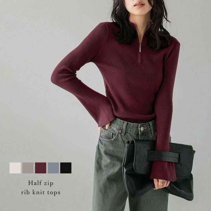 ハーフジップ リブニット トップス コンパクト ハイネック [AMELY by La-gemme]ハーフジップ リブニット トップス コンパクト ハイネック フレアスリーブ 華奢見え レディース おすすめ おしゃれ 2025春夏新作 【atpaw24-849】【即納:1-5営業日】【送料無料】メ込2