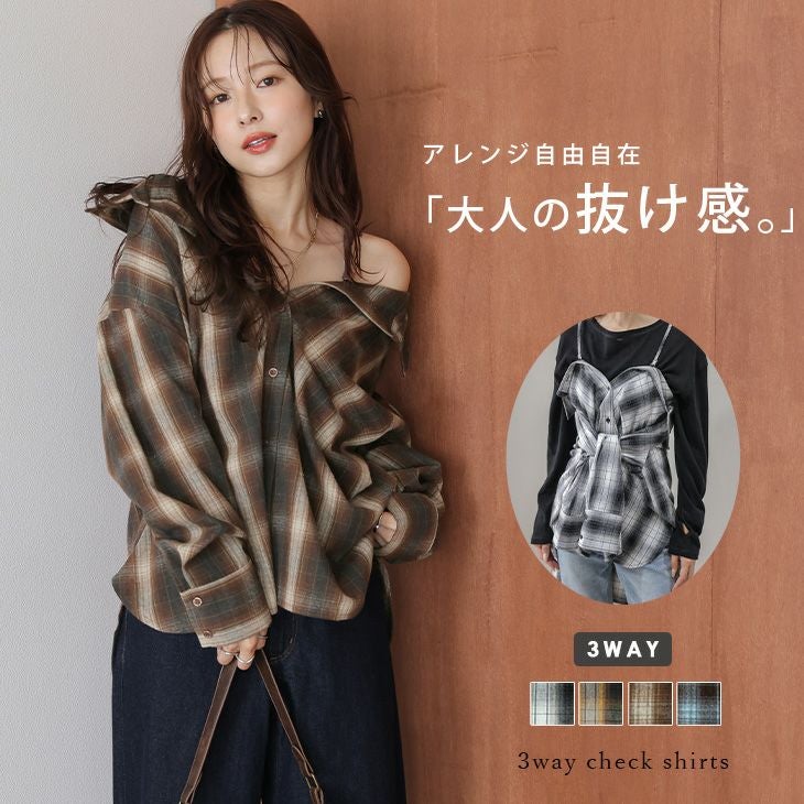 3way チェックシャツ ビスチェ オフショル レイヤード 【春夏半額SALE対象】 [AMELY by La-gemme]3way チェックシャツ ビスチェ オフショルダー レイヤード 重ね着 カジュアル ネルシャツ レディース フリーサイズ メール便 2025秋冬新作【atpaw25-1654】【即納:1-5営業日】【送料無料】メ込2