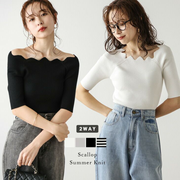 サマーニット スカラップ 2way 5分袖 リブニット 【春夏半額SALE対象】 [AMELY by La-gemme]サマーニット スカラップ 2way 5分袖 リブニット 細見え オフショルダー キレイめ 大人 レディース フリーサイズ メール便 2025春夏新作【atpss24-380】【即納:1-5営業日】【送料無料】ユ込2
