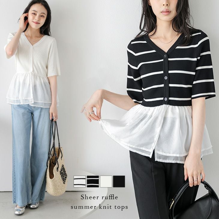 シアーフリル ドッキング サマーニット リブ トップス [AMELY by La-gemme]シアーフリル ドッキング サマーニット リブ トップス Vネック 華奢 スタイルアップ レディース おすすめ おしゃれ 2025春夏新作 【atpss25-1360】【即納:1-5営業日】【送料無料】メ込2