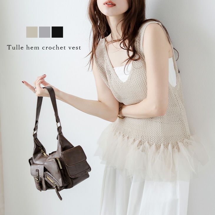 ベスト かぎ編み サマーニット チュールリボン Vネック 【春夏半額SALE対象】 [AMELY by La-gemme]ベスト かぎ編み サマーニット チュールリボン Vネック レイヤード 透け感 こなれ感 フェミニン アウター レディース 2025春夏新作 【atpss25-1447】【即納:1-5営業日】【送料無料】メ込2
