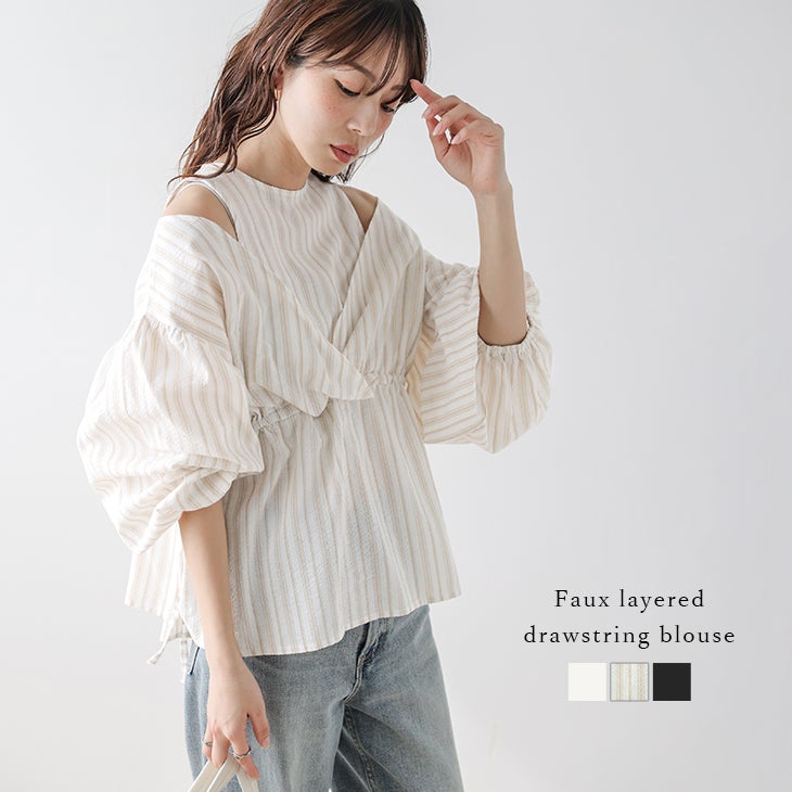 ブラウス フェイクレイヤード ペプラム ぽわん袖 [AMELY by La-gemme]ブラウス フェイクレイヤード ペプラム ぽわん袖 肩出しトップス バルーンスリーブ ドローコード サイドリボン タンクトップ レディース おすすめ おしゃれ フリーサイズ メール便 2026春夏新作【atpss26-1835】【即納:1-5営業日】【送料無料】メ込2