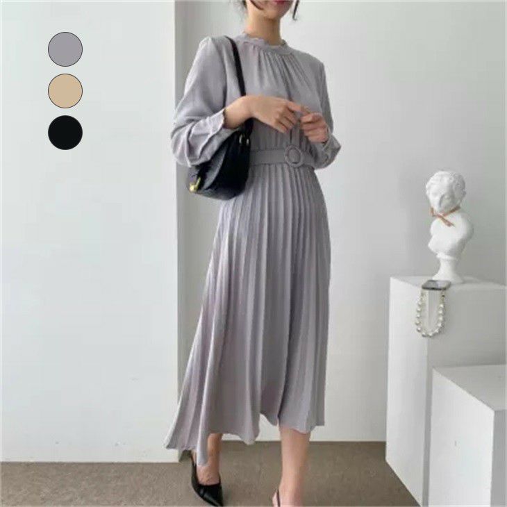 [AMELY by La-gemme]プリーツワンピース ロング丈 ウエストマーク 長袖 シンプル フレア Aライン きれいめ フレアワンピース オシャレ オフィス デート 春 レディース韓国ファッション【awp22-026】【即納:1-5営業日】【送料無料】メ込2