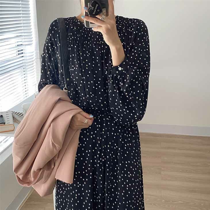 [AMELY by La-gemme]ワンピース ウエストシャーリングワンピース ドット柄 [AMELY by La-gemme]ワンピース ウエストシャーリングワンピース ドット柄 ラウンドネック カジュアル きれいめ おしゃれ お出かけ 花見 ブラック レディース 韓国ファッション 【awp302-013】【予約販売:15-20日】【送料無料】メ込2