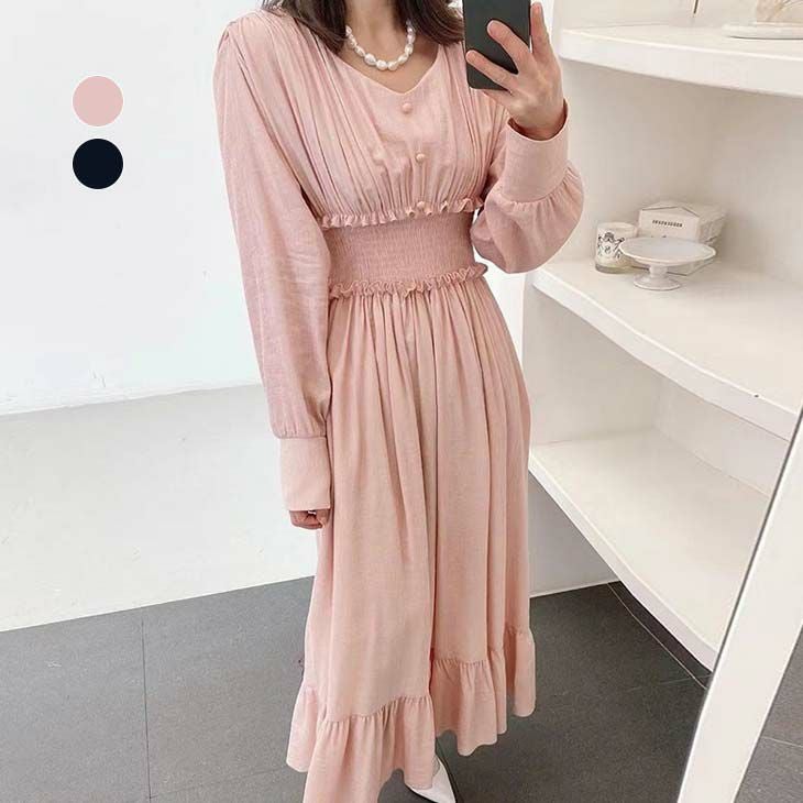 [AMELY by La-gemme]ワンピース ロング Vネック [AMELY by La-gemme]ワンピース ロング Vネック 無地 シンプル ベーシック フリル 上品 高見え 綺麗め 大人可愛い おしゃれ デート 女子会 レディース おすすめ 春夏 プチプラ 韓国ファッション 【awp302-019】【予約販売:15-20日】【送料無料】メ込2