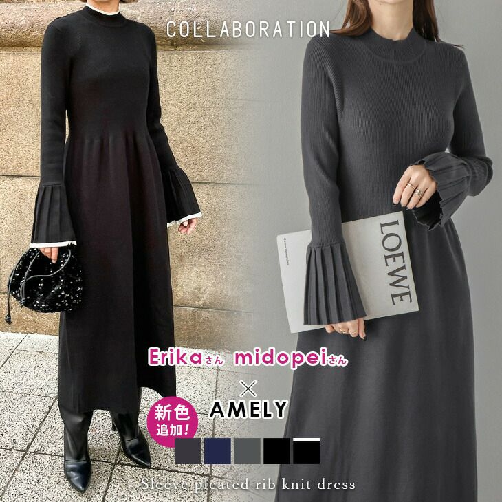 ニットワンピース プリーツスリーブ ベルスリーブ [AMELY by La-gemme]ニットワンピース プリーツスリーブ ベルスリーブ リブニット フレア レディース おすすめ おしゃれ ブラック 2025春夏新作 【awp307-595】【即納:1-5営業日】【送料無料】宅込