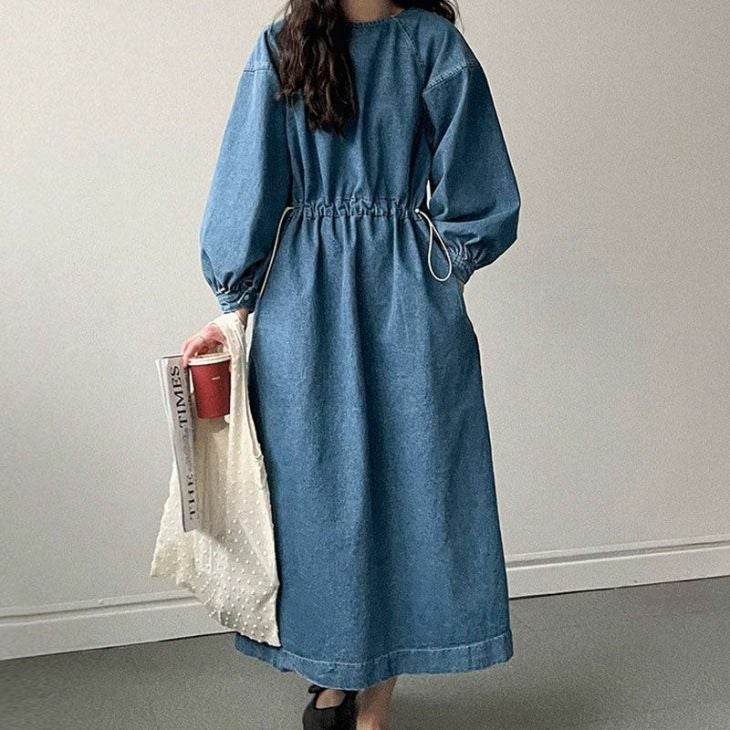 デニムワンピース ドローコード ロング 可愛い 大人カジュアル [AMELY by La-gemme]デニムワンピース ドローコード ロング 可愛い 大人カジュアル ぽわん袖 シンプル 体型カバー おすすめ おしゃれ レディース トレンド 人気 プチプラ 韓国ファッション 2025春夏新作 【awp401-145】【予約販売:15-20日】【送料無料】宅込