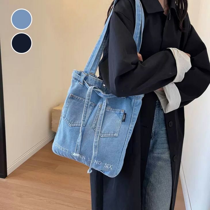 トートバッグ デニム リボン リメイク風 肩掛け [AMELY by La-gemme]トートバッグ デニム リボン リメイク風 肩掛け ロゴ ポケット かばん レディース 通勤 通学 トレンド 人気 プチプラ 韓国ファッション 【azkss24-202】【予約販売:15-20日入荷予定順次発送】【送料無料】60込