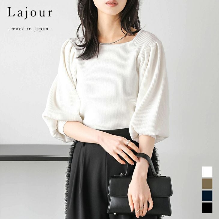 日本製 スクエアネック パフショルダー リブニット トップス [Lajour made in Japan]日本製 スクエアネック パフショルダー リブニット トップス レディース シンプル おすすめ おしゃれ 2025春夏【laj-001】【即納:1-5営業日】【送料無料】60込