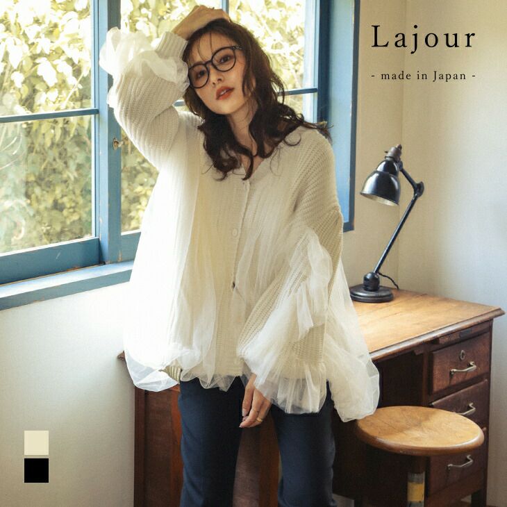 Lajour made in Japan 日本製 【春夏半額SALE対象】 [Lajour made in Japan]日本製 カーディガン ルーズシルエット ローゲージニット チュール レイヤード ギャザー ドッキング 異素材 トップス レディース おすすめ おしゃれ 2025春夏新作 【laj-ot078】【即納:1-5営業日】【送料無料】宅込
