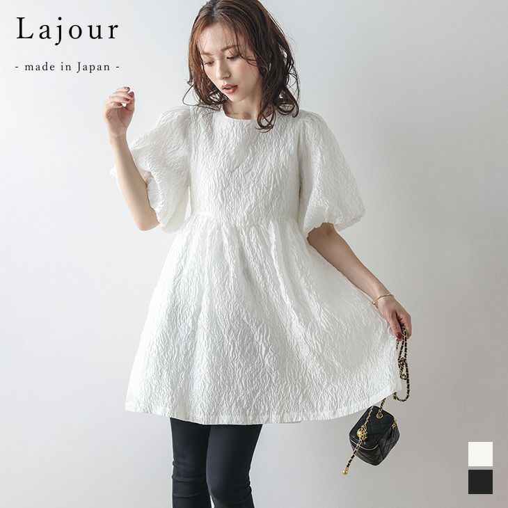 ペプラム ワンピース トップス ジャガード パフスリーブ 【クーポン利用で35%OFF】[Lajour mada in Japan] 日本製 ペプラム ワンピース トップス ジャガード パフスリーブ リボン チュニックブラウス 半袖 レディース おすすめ おしゃれ 2025春夏新作 【laj-tp055】【即納:1-5営業日】【送料無料】メ込2