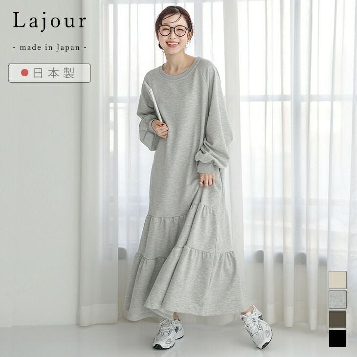Lajour made in Japan 日本製 【秋冬半額SALE対象】 [Lajour mada in Japan] 日本製 ワンピース ぽわん袖 ティアードギャザー スウェット スエット 裏毛 ロング ゆったり 体型カバー 長袖 レディース おすすめ おしゃれ 2025春夏新作 【laj-wp064】【即納:1-5営業日】【送料無料】宅込