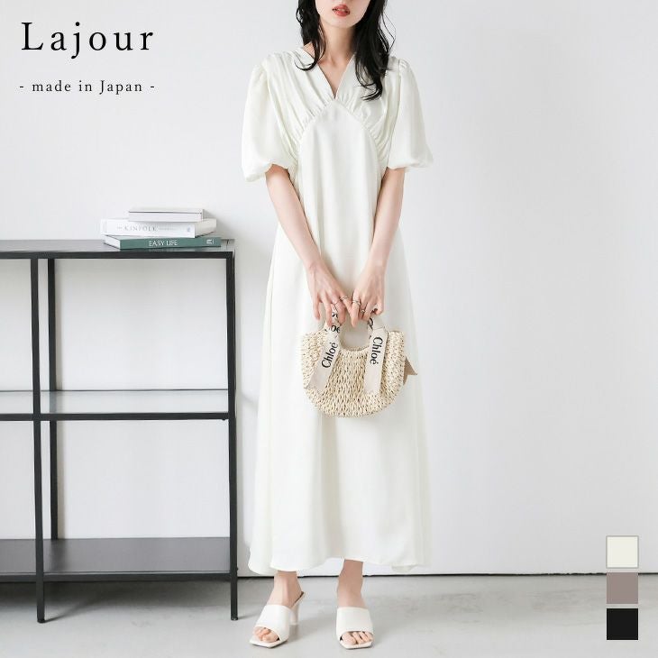 Lajour made in Japan 日本製 【クーポン利用で35%OFF】 [Lajour mada in Japan] 日本製 ワンピース 上品 サテン ギャザー ドレープ パフスリーブ フェミニン 華やか オケージョン 半袖 レディース おすすめ おしゃれ 2025春夏新作 【laj-wp097】【即納:1-5営業日】【送料無料】メ込2