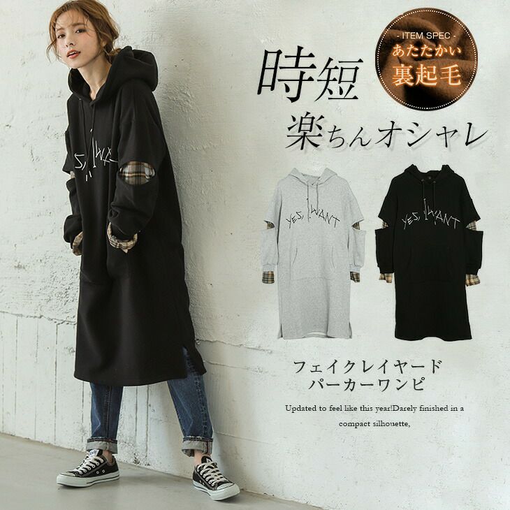 フェイクレイヤード パーカー ワンピース 裏起毛 レディース フェイクレイヤード パーカーワンピース ワンピース 裏起毛 レディース 重ね着風 ロングワンピース ワンピ ロング ロゴ カジュアル スリット おしゃれ 可愛い ブラック 2025秋新作 フリー 【lgww-at3587】【即納:1-5営業日】【送料無料】宅込