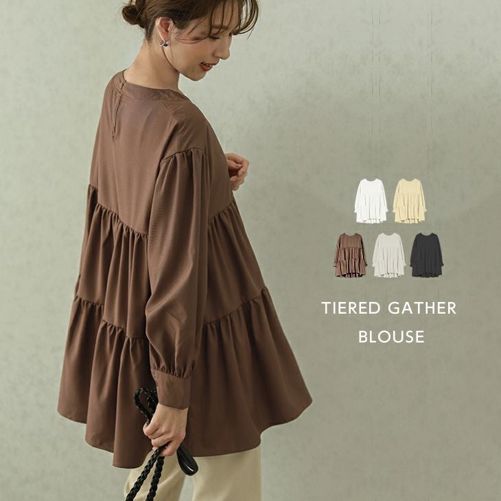ティアード ギャザー ブラウス レディース 長袖 ティアード ギャザー ブラウス レディース 長袖 トップス Aライン チュニック フリル クルーネック 体型カバー ゆったり 無地 シャツ 大人可愛い ブラック ホワイト メール便 2025秋新作 フリー 【lgww-at3768】【即納:1-5営業日】【送料無料】メ込2