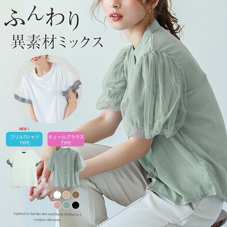 チュール パブスリーブ ブラウス レディース 半袖 【最終入荷!ラストチャンス!】チュール パブスリーブ ブラウス レディース 半袖 五分袖 トップス シアー 透け感 チュール袖 シャツ バンドカラー 大人可愛い フェミニン 上品 ブラック ホワイト メール便 2025秋新作 M/L 【lgww-at3814】【即納:1-5営業日】【送料無料】メ込2
