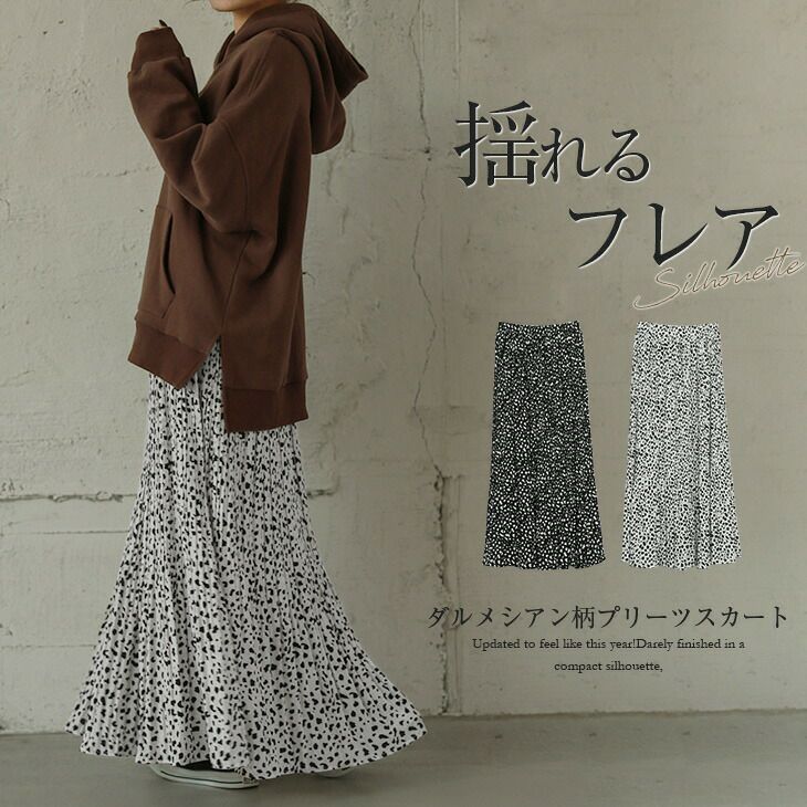 再販開始! ダルメシアン柄 プリーツスカート スカート ロング レディース アニマル柄 Aライン 大人 マキシ丈 ロングスカート ウエストゴム ボトムス 楽ちん 2025秋新作 フリー 【lgww-at4150】【即納:1-5営業日】【送料無料】メ込2