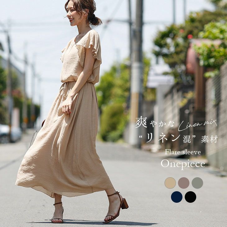 ワンピース レディース マキシ丈 フレア リネン リネン混 ワンピース レディース マキシ丈 フレア フリルスリーブ ウエストリボン ロング丈 大人 ナチュラル おしゃれ 可愛い ブラック メール便 2025秋新作 フリー 【lgww-at4536】【即納:1-5営業日】【送料無料】メ込2