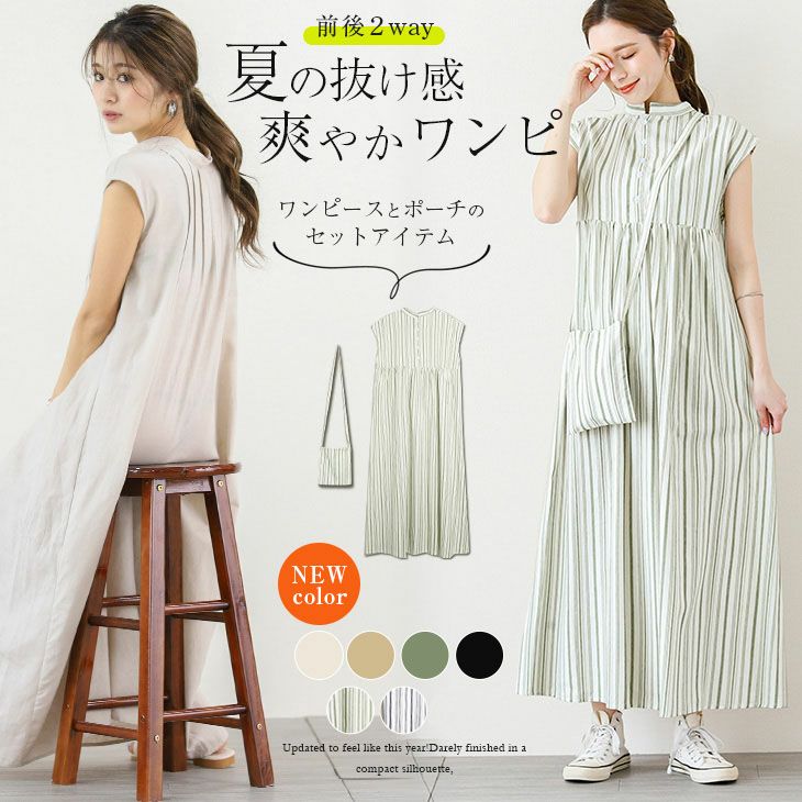 ショルダーポーチ付き! ストライプ ロングワンピース 【残り僅か!人気商品】新色追加! ショルダーポーチ付き 2way ロングワンピース レディース フレンチスリーブ ノースリーブ ストライプ 亜麻混 リネン マキシ丈 バンドカラー ゆったり 夏 メール便 2025秋新作 フリー 【lgww-at4539】【即納:1-5営業日】【送料無料】メ込2