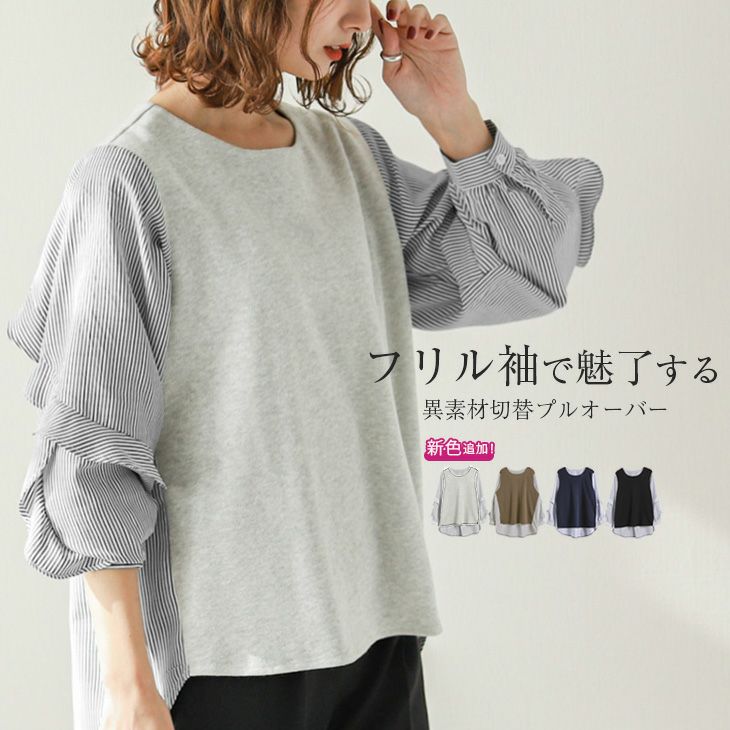 異素材ドッキング プルオーバー 長袖 レディース 異素材ドッキング プルオーバー 長袖 レディース デザイントップス カットソー トップス ボリューム袖 フリル袖 ストライプ 切替 ゆったり おしゃれ 大人可愛い カジュアル メール便 2025秋新作 フリー 【lgww-at4916】【即納:1-5営業日】メ込1