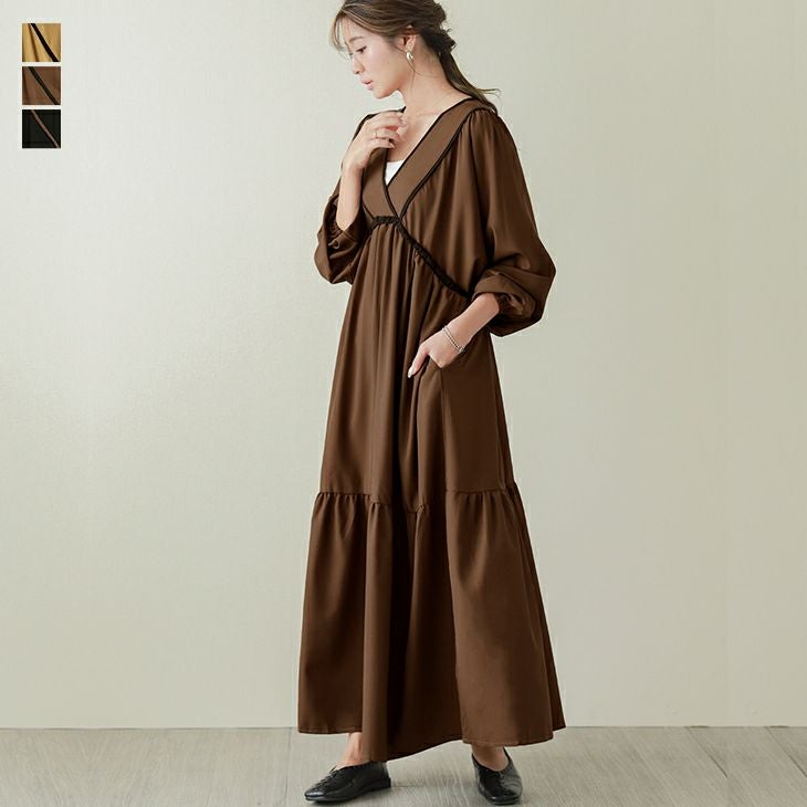 Vネック ギャザーワンピース レディース 長袖 マキシ丈 Vネック ギャザーワンピース レディース 長袖 マキシ丈 ロング丈 ワンピ Aライン パイピング きれいめ フレア ティアード ポケット ウエストリボン 大人 可愛い ブラック メール便 2025秋新作 フリー 【lgww-at4978】【即納:1-5営業日】メ込3