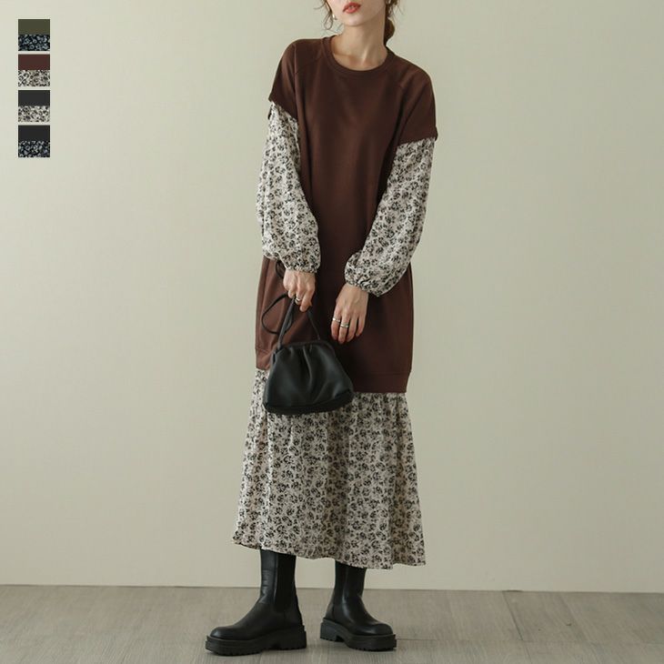 ドッキングワンピース レディース フラワー柄 重ね着風 ドッキングワンピース レディース フラワー柄 重ね着風 ロング丈 クルーネック おしゃれ 可愛い ブラック メール便 2025秋新作 フリー 【lgww-at4985】【即納:1-5営業日】【送料無料】メ込2