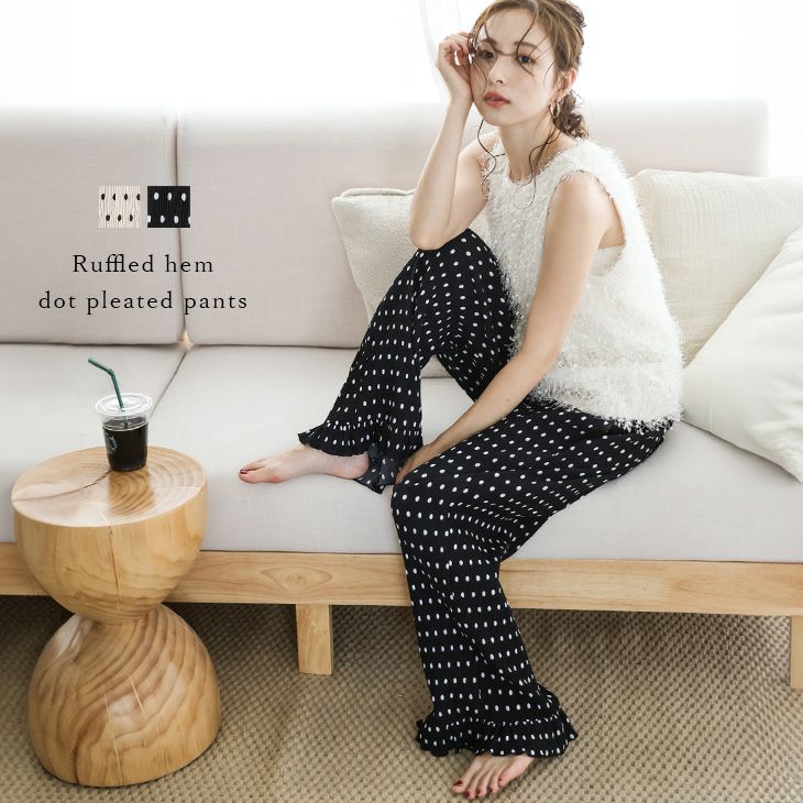 パンツ プリーツパンツ ドット柄 裾フリル イージーパンツ 【春夏半額SALE対象】 パンツ プリーツパンツ ドット柄 裾フリル イージーパンツ フェミニン ウエストゴム 脚長 ボトムス レディース 2025春夏新作 【lsbtss24-514】【即納:1-5営業日】【送料無料】ユ込3