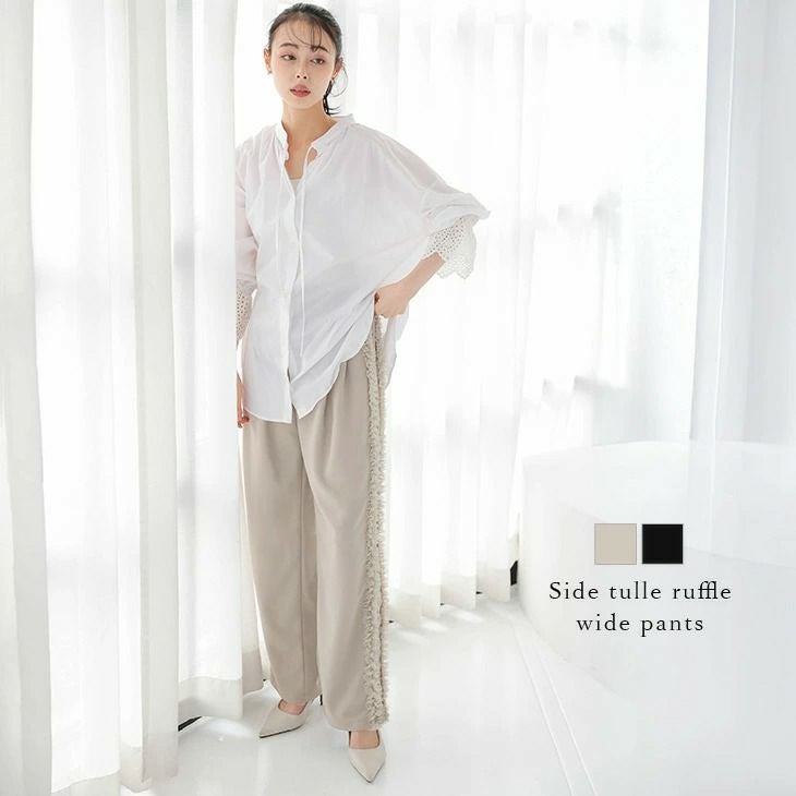 ボトムス ワイドパンツ サイド チュール フリル 【春夏半額SALE対象】 ボトムス ワイドパンツ サイド チュール フリル タック 上品 甘い フェミニン 大人カジュアル レディース おすすめ おしゃれ フリーサイズ 2025春夏新作【lsbtss25-1024】【即納:1-5営業日】【送料無料】60込