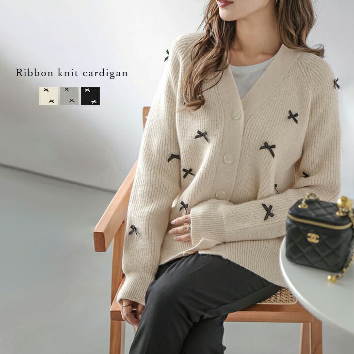 カーディガン ニット リボン リブニット ガーリー 【秋冬半額SALE対象】 カーディガン ニット リボン リブニット ガーリー Vネック ミディアム トップス レディース おすすめ おしゃれ ブラック フリーサイズ 2025春夏新作 【lsot304-32d】【即納:1-5営業日】【送料無料】宅込