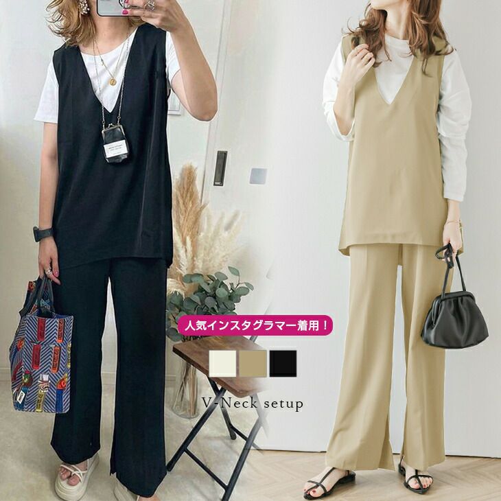 Vネック セットアップ セットアイテム フレア レディース 【春夏半額SALE対象】 Vネック セットアップ ベスト ジレ パンツ ナチュラルカラー セットアイテム フレア レディース メール便 2025春夏【lsse203-347】【即納:1-5営業日】 【送料無料】ユ込3