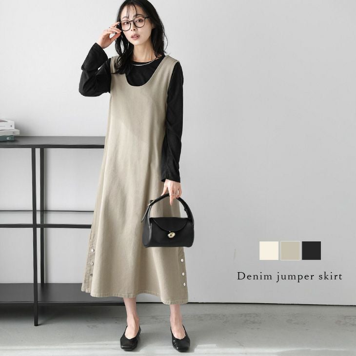 デニム ジャンパースカート Uネック サイドボタン 【春夏半額SALE対象】 デニム ジャンパースカート Uネック Vネック サイドボタン ロング丈 オールシーズン 体型カバー レディース おすすめ おしゃれ フリーサイズ メール便 2025春夏新作【lssrss25-990】【即納:1-5営業日】【送料無料】メ込2