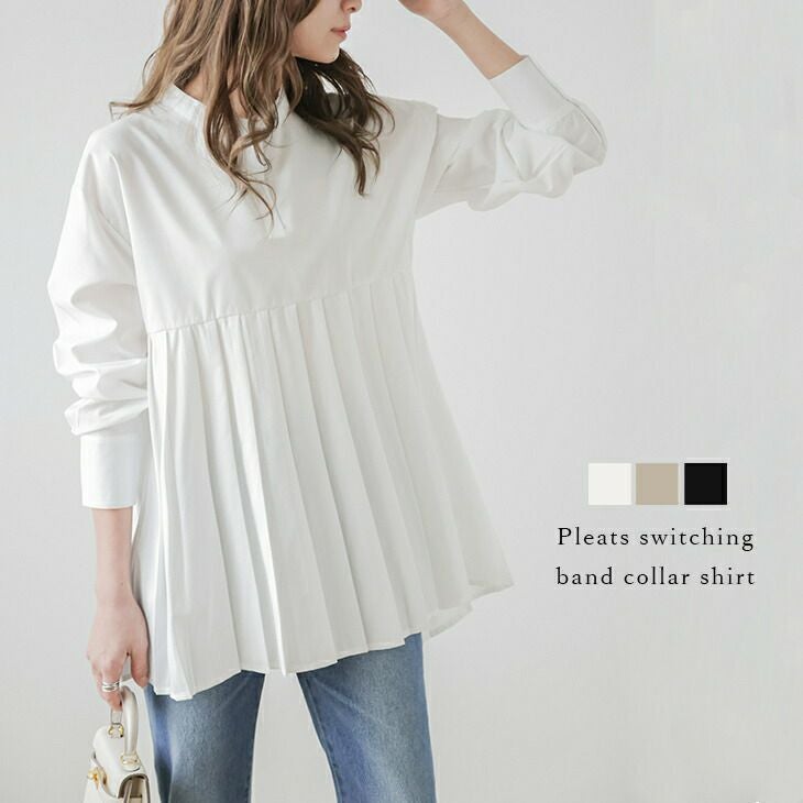 シャツ バンドカラーシャツ プリーツスウィッチング トップス 【春夏半額SALE対象】 シャツ バンドカラーシャツ プリーツ キレイめ 大人可愛い 上品 トップス レディース Aライン ゆったり シンプル 大人 2025春夏 【lstp211-345】【即納:1-5営業日】【送料無料】ユ込3