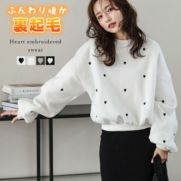 トップス スウェット プルオーバー ハート 刺繍 【秋冬半額SALE対象】 トップス スウェット プルオーバー ハート 刺繍 裏起毛 ドロップショルダー ラウンドネック ぽわん袖 長袖 レディース おすすめ おしゃれ 2025春夏新作 【lstpaw24-666】【即納:1-5営業日】【送料無料】60込