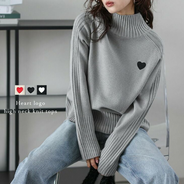 ハートロゴ 刺繍 ハイネック ニット トップス ハートロゴ 刺繍 ハイネック ニット トップス リブ 体型カバー 華奢見え キレイめ 大人可愛い トレンド レディース おすすめ おしゃれ フリーサイズ 2025春夏新作【lstpaw24-697】【即納:1-5営業日】【送料無料】60込