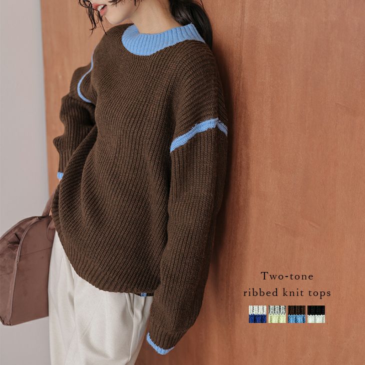 バイカラー 配色デザイン リブニット ローゲージニット 【秋冬半額SALE対象】 バイカラー 配色デザイン リブニット ローゲージニット ドロップショルダー モックネック 長袖 トップス レディース おすすめ おしゃれ 2025秋冬新作 【lstpaw25-1801】【即納:1-5営業日】【送料無料】宅込