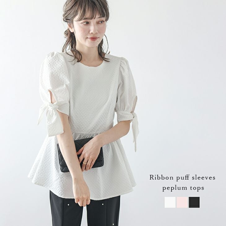 トップス ジャガード ペプラム リボン パフスリーブ 【春夏半額SALE対象】 トップス ジャガード ペプラム リボン パフスリーブ ラウンドネック フレア 5分袖 レディース フリーサイズ メール便 2025春夏新作【lstpss24-341】【即納:1-5営業日】【送料無料】メ込2