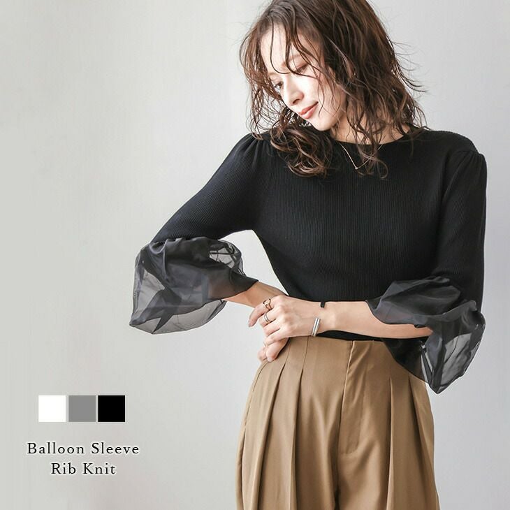 【AW】ニット バルーンスリーブ オーガンジー リブ 七分袖 ニット バルーンスリーブ オーガンジー リブ 七分袖 異素材切替え 着痩せ キレイめ トレンド レディース おすすめ おしゃれ フリーサイズ メール便 2025春夏新作【lstpss24-502】【即納:1-5営業日】【送料無料】メ込2