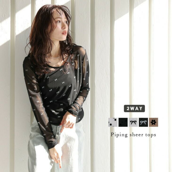 シアートップス 前後2way フロッキープリント ドット リボン 【春夏半額SALE対象】 シアートップス 前後2way フロッキープリント ドット リボン フラワー レイヤード 長袖 トップス レディース おすすめ おしゃれ フリーサイズ 2025春夏新作 【lstpss24-891】【即納:1-5営業日】【送料無料】ユ込2
