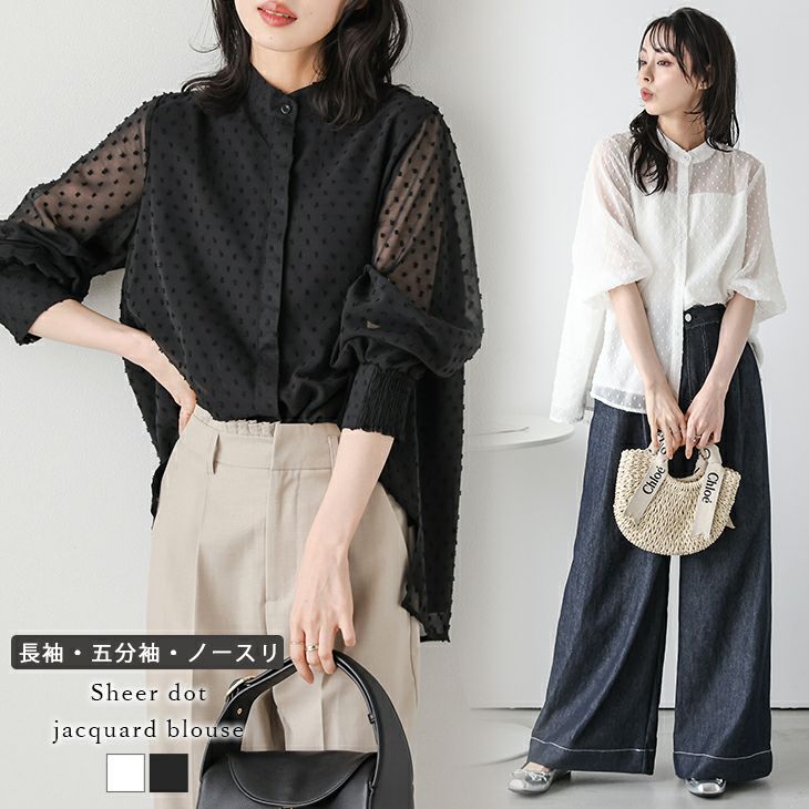 ブラウス シアー バンドカラー 比翼仕立て 【春夏半額SALE対象】 五分袖 ノースリーブ ブラウス シアー バンドカラー 比翼仕立て ドットジャガード ぽわん袖 レイヤード インナー 長袖 トップス レディース おすすめ おしゃれ 2025春夏新作 【lstpss24-893】【予約販売:4月2日入荷予定順次発送】【送料無料】ユ込2