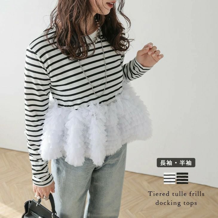 トップス ペプラム チュール ドッキング ボーダー 【春夏半額SALE対象】 トップス ペプラム 長袖 チュール ドッキング ボーダー ガーリー フェミニン トップス レディース フリーサイズ 2025春夏新作 【lstpss25-1266】【予約販売:4月2日入荷予定順次発送】【送料無料】メ込3