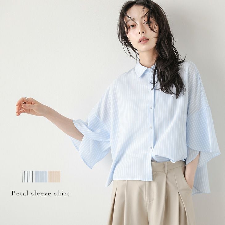 ペタルスリーブ デザイン袖 ブラウス ストライプ 【春夏半額SALE対象】 ペタルスリーブ デザイン袖 フレア ブラウス ストライプ 大人かわいい ドロップショルダー 5分袖 クロップド丈 レディース おすすめ おしゃれ フリーサイズ メール便 2025春夏新作【lstpss25-1423】【即納:1-5営業日】【送料無料】メ込2