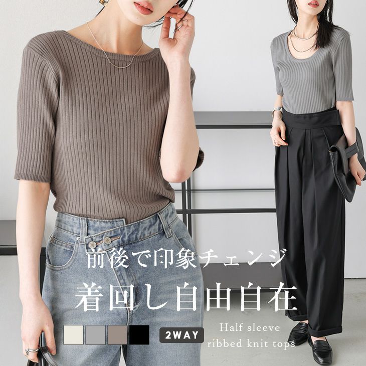 前後2way 5分袖 リブニット トップス ラウンドネック Uネック 【春夏半額SALE対象】 前後2way 5分袖 リブニット トップス ラウンドネック Uネック レディース フリーサイズ 2025春夏新作 【lstpss25-983】【即納:1-5営業日】【送料無料】ユ込2