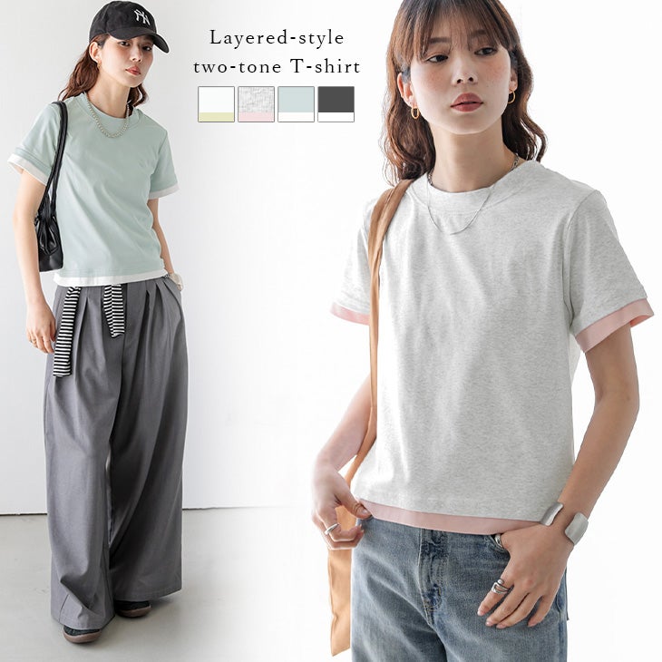 レイヤード風 バイカラー Tシャツ 半袖 配色 レイヤード風 バイカラー Tシャツ 半袖 配色 トップス コンパクト 華奢見え レディース おすすめ おしゃれ フリーサイズ メール便 2026春夏新作【lstpss26-2033】【予約販売:4月30日入荷予定順次発送】【送料無料】メ込2
