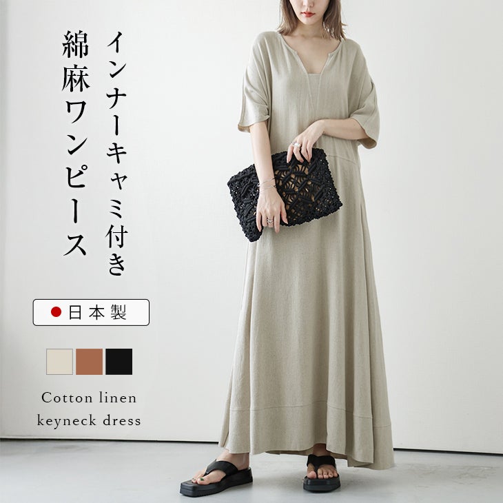 日本製 ロングワンピース ワンピース ロング キーネック 日本製 ロングワンピース ワンピース ロング キーネック コットン リネン インナー付き 半袖 レディース 2025秋新作 【lswp204-428】【即納:1-5営業日】【送料無料】宅込